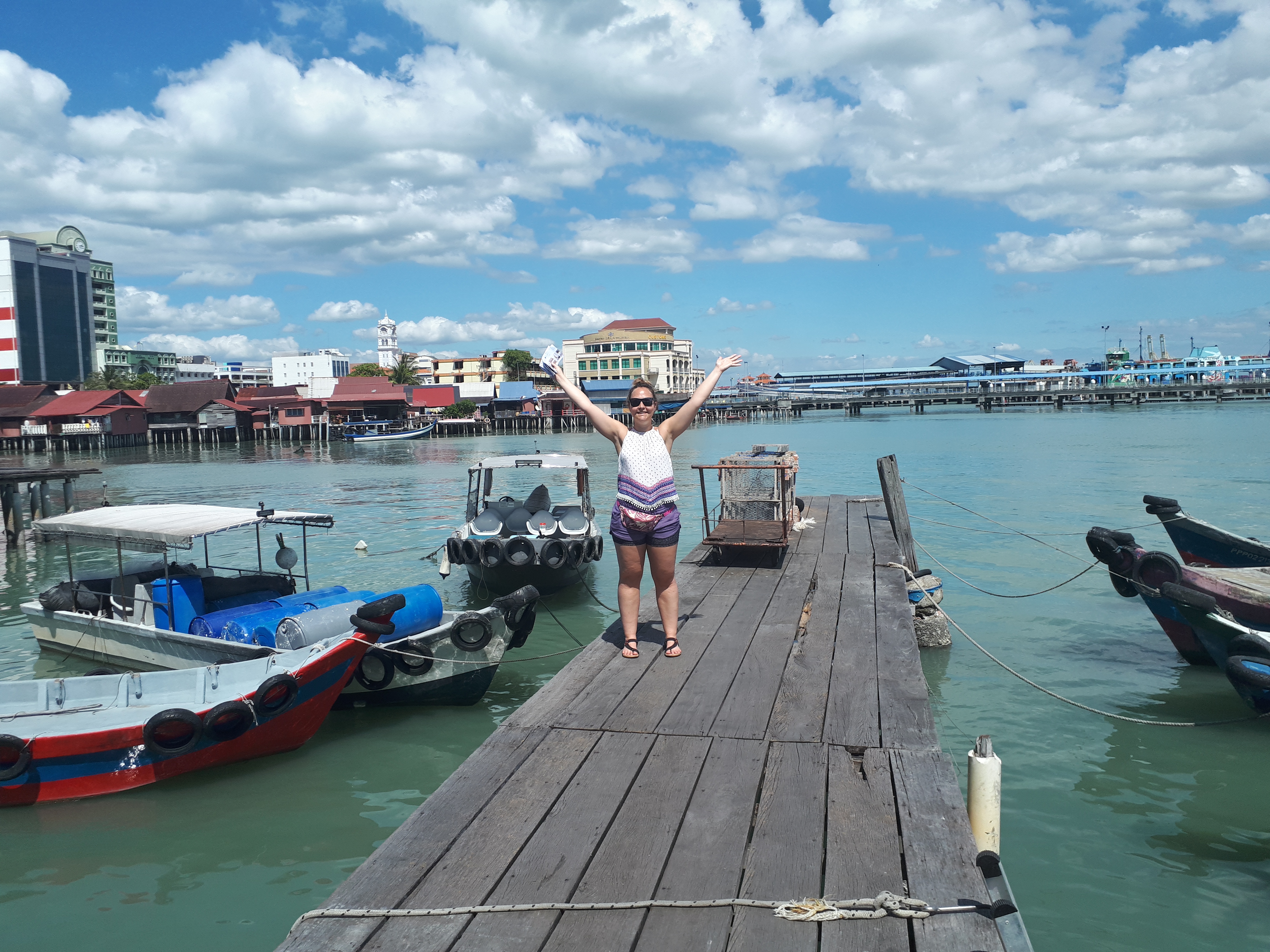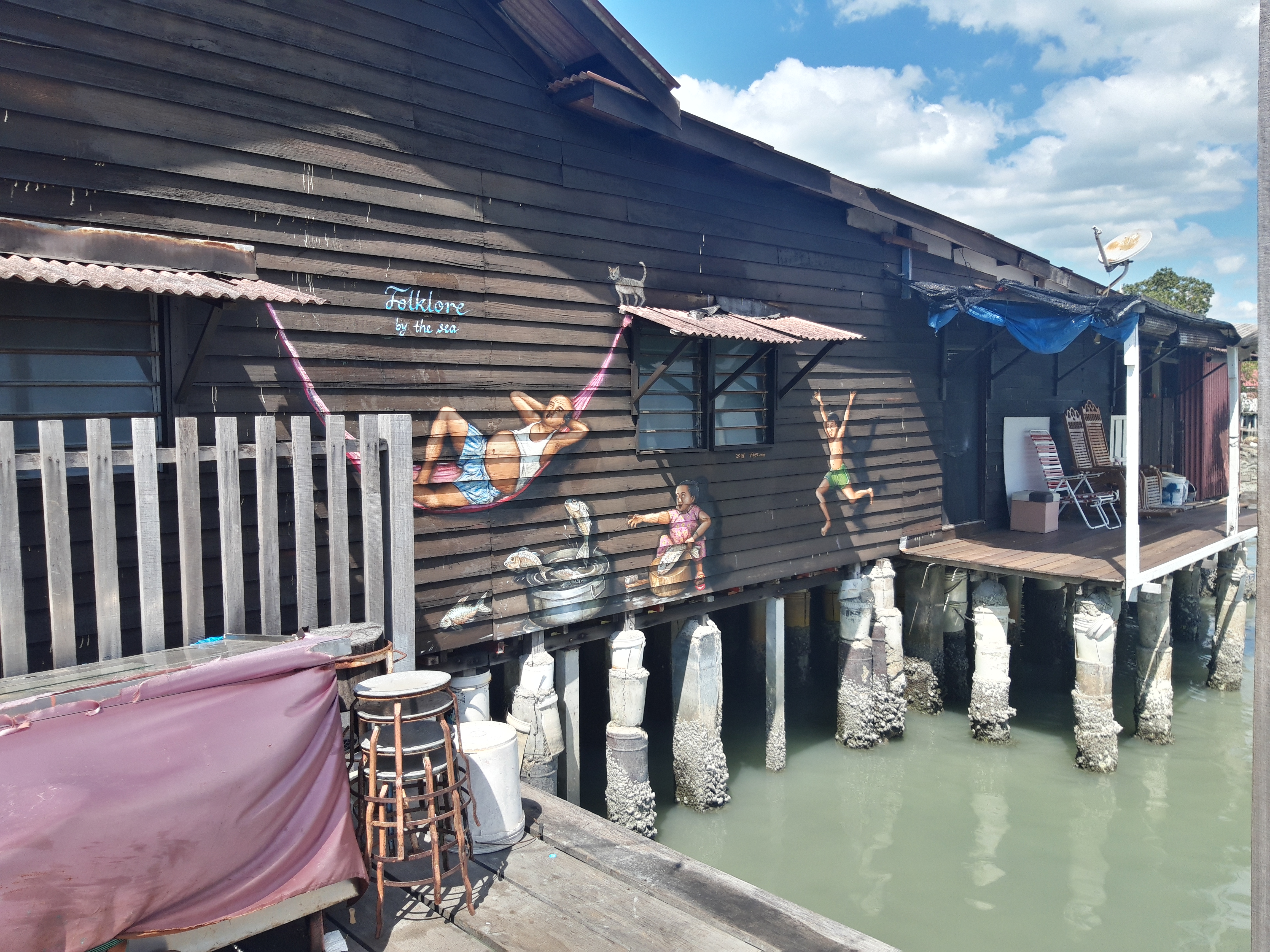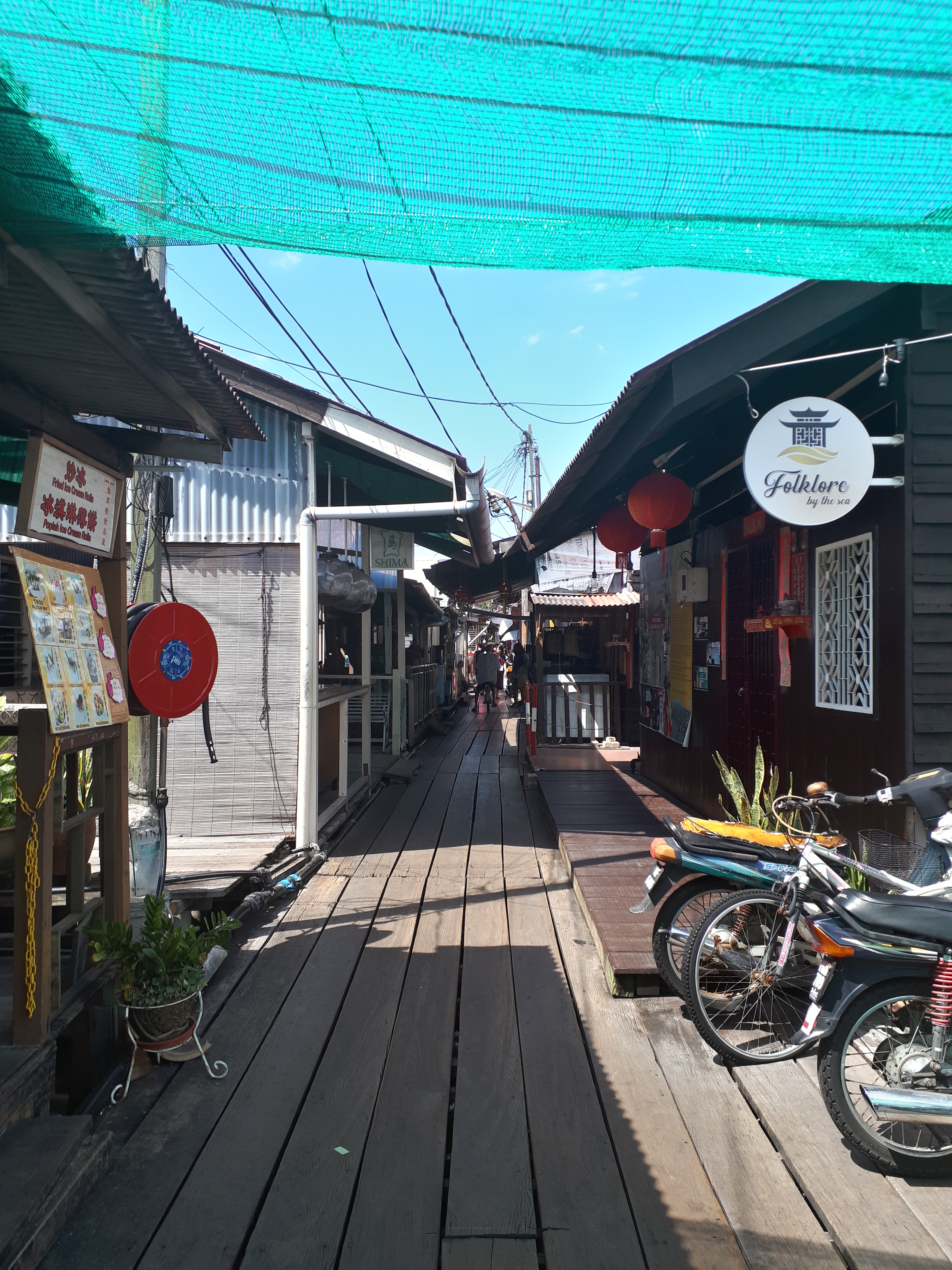 At the waterside, there are a bunch of Jettys besides the main one that our ferry boat arrived at. We didn’t even hear about this in our books and google searches of ‘what to do in George Town’, but we stumbled upon the Chew Jetty just as we were finishing up our street art explorations. Apparently its a big tourist attraction. We saw people going down a walkway through what looked like a randomly placed cluster of houses made of pikes of wood. So we followed. The Jettys are named after the chinese clan that originally built it up, the Chew Jetty being the home of the Chew family. This one has the longest walkways and is tourist friendly with lots of little shops and food stalls as you walk through. As you go further in, the water underneath gets a bit higher and you are really up on some wooden stilts over the water. Wild. I have never ever seen anything like this before.